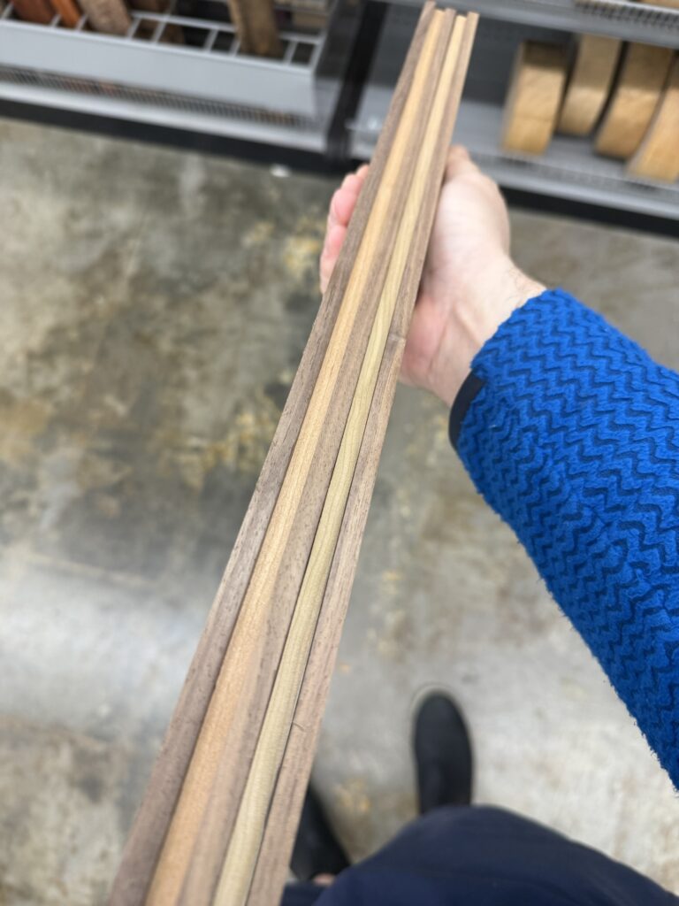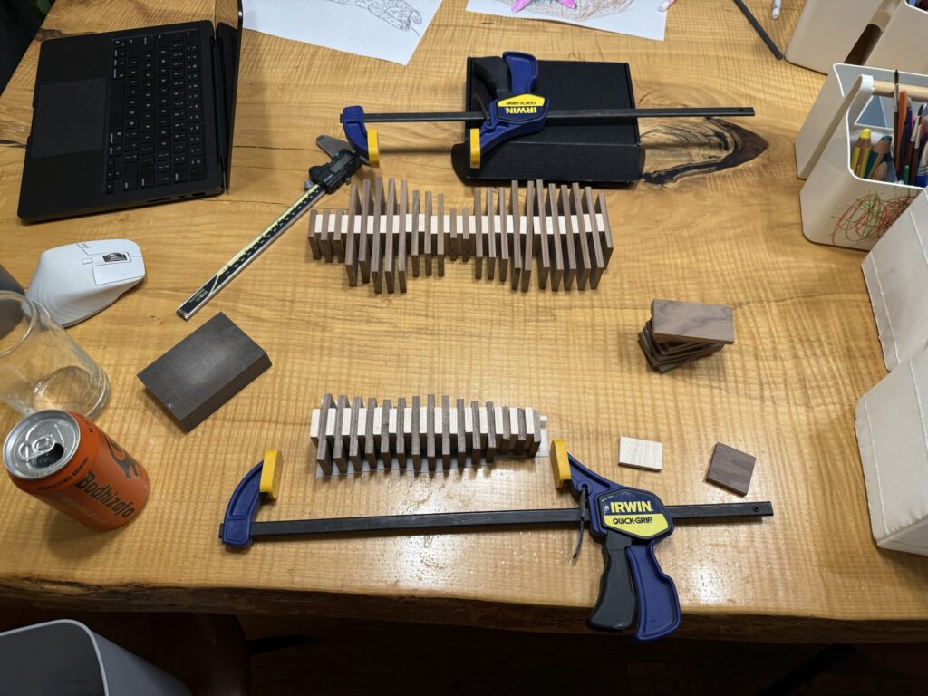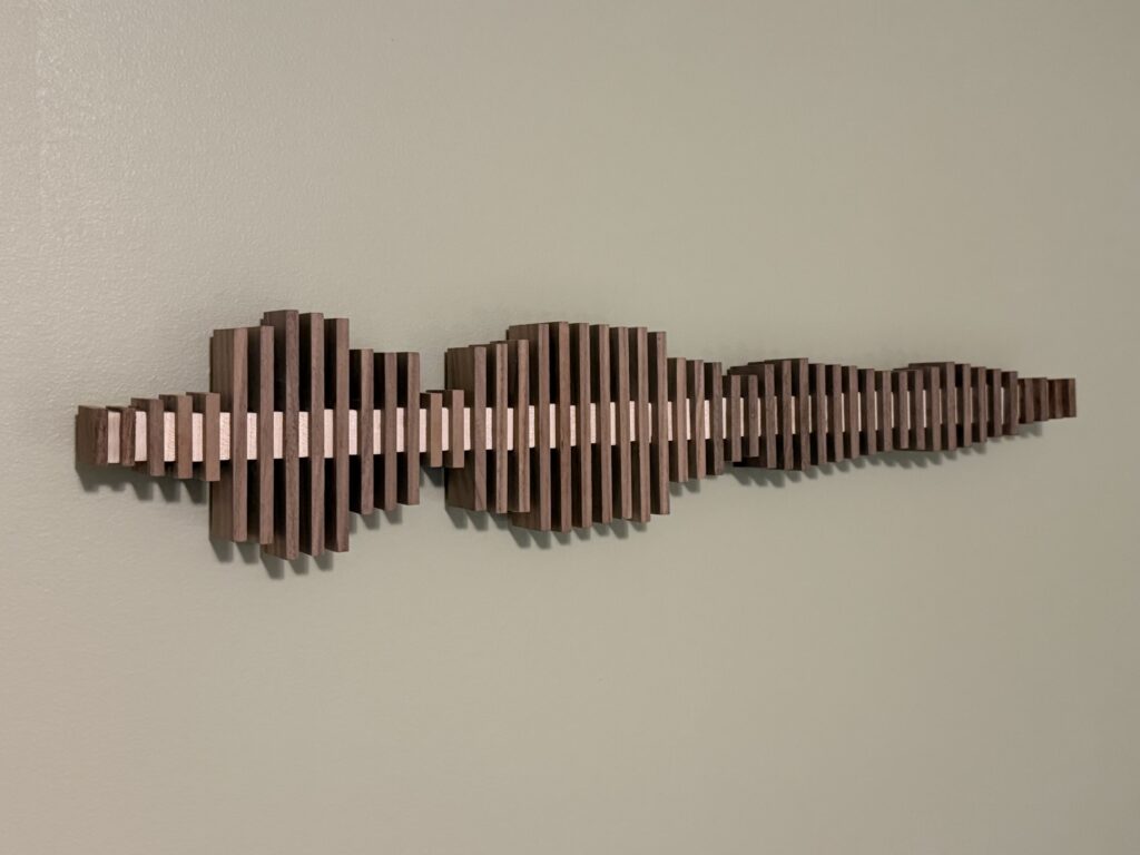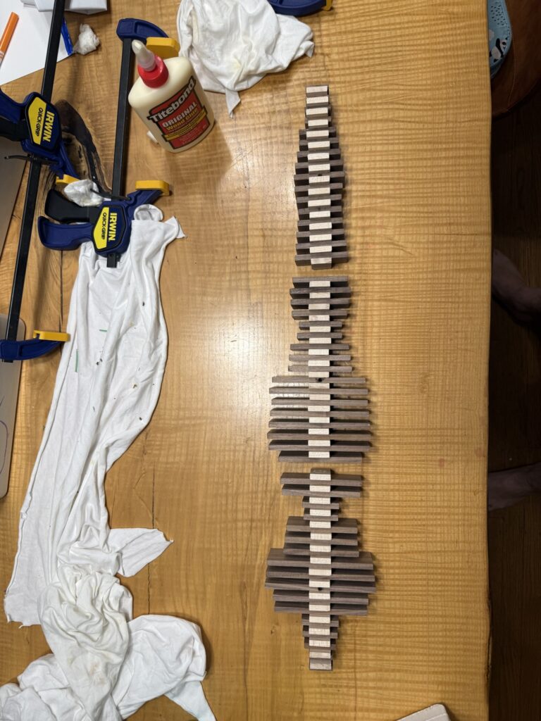 Original waveform Downsampled to 50 bars and amplitude scaled to make full use of the walnut boardsI spent maybe 3 hours at the hardwood store thinking about different combos of materials, thicknesses, spacers, etc.chop 👏 chop 👏Laying things out for the first time!I designed + printed some fixtures to line everything up on center and set the spacers back 1/4”. Originally I was planning to drill a hole thru the center of every piece and skewer it all on a walnut dowel rod, but this felt like less work 😅 Give ‘em the clamps!Had to get creative because my clamps weren’t long enough 🫣 Looks better than I could have possibly imagined!!