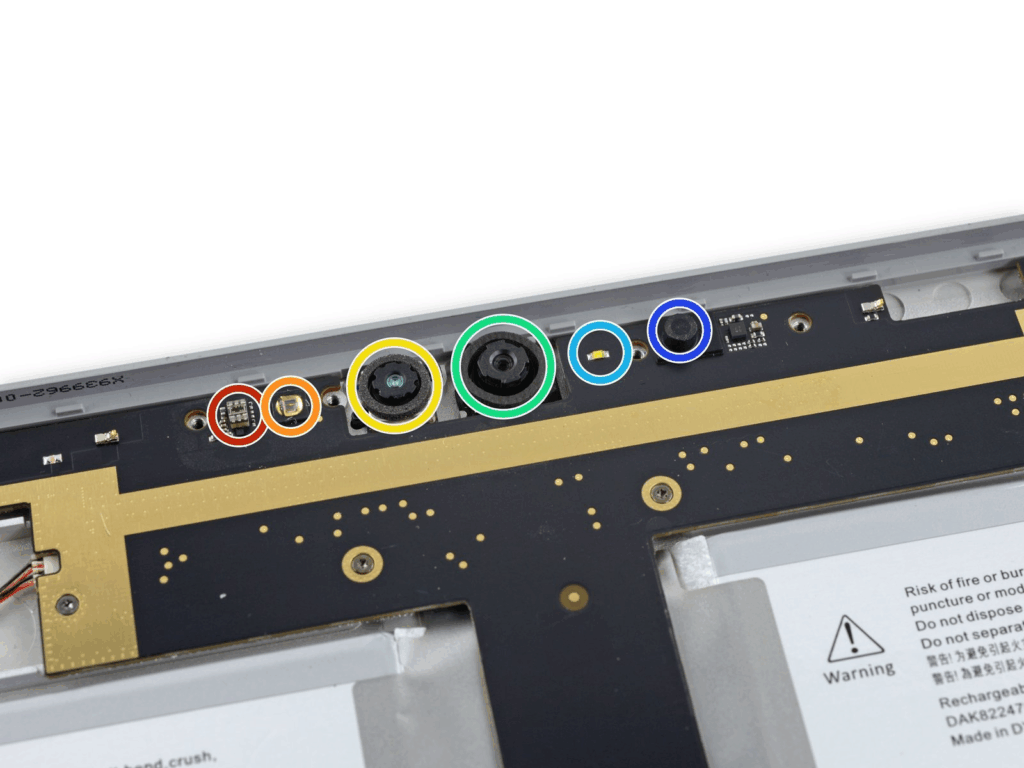 Surface Book 13.5″ (left to right) ambient light sensor (ALS) with novel interposer design (not shown: micro-hole array), infrared (IR) illumination LED (not shown: my patented self-registering condensation lens!), IR camera, RGB camera, privacy LED (not shown: injection molded light pipe), front mic boot, accelerometer